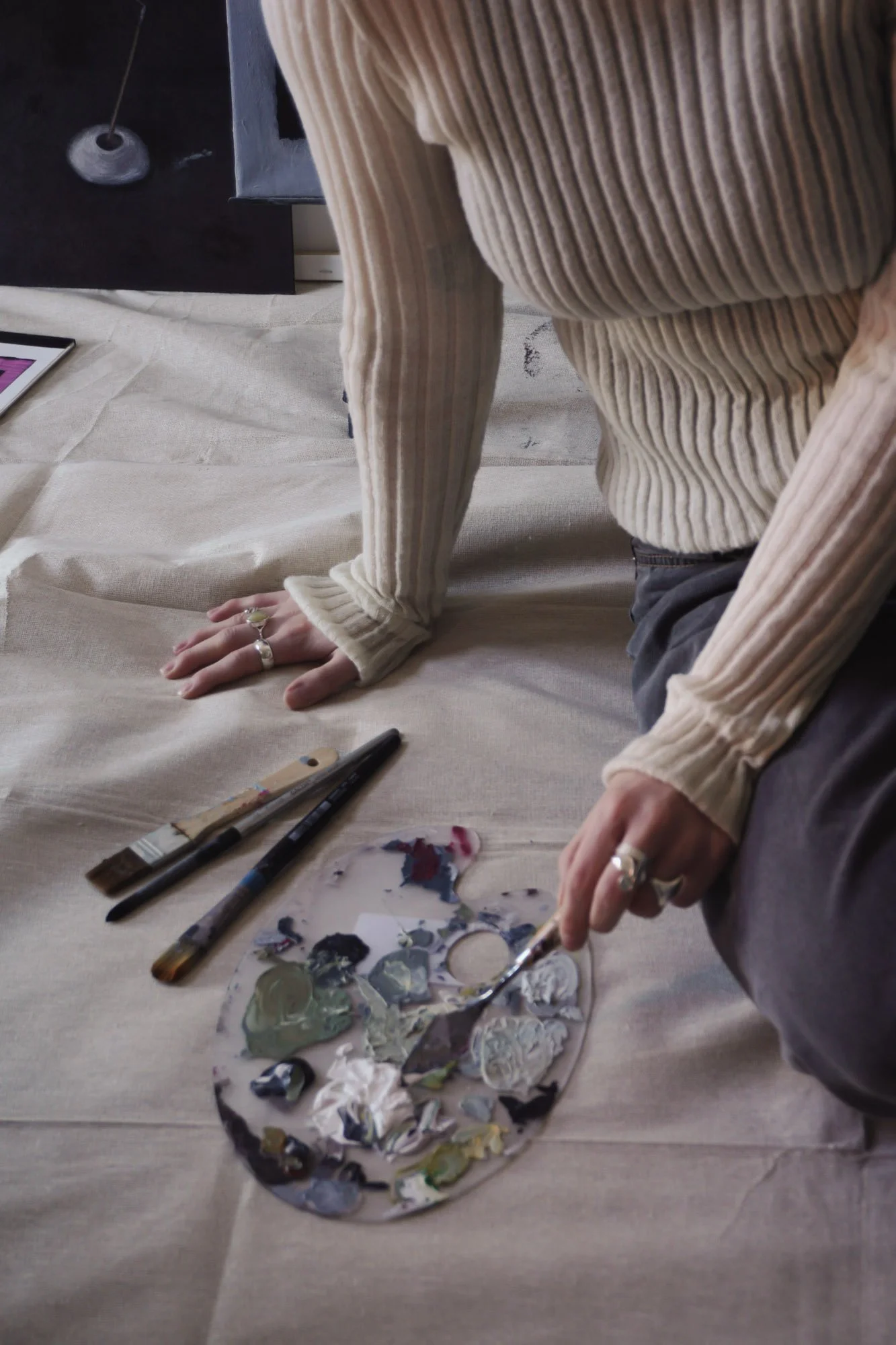 Through painting, I explore the moments that sit between. Think of it as a study of tension – between softness and sharpness, comfort and discomfort.
